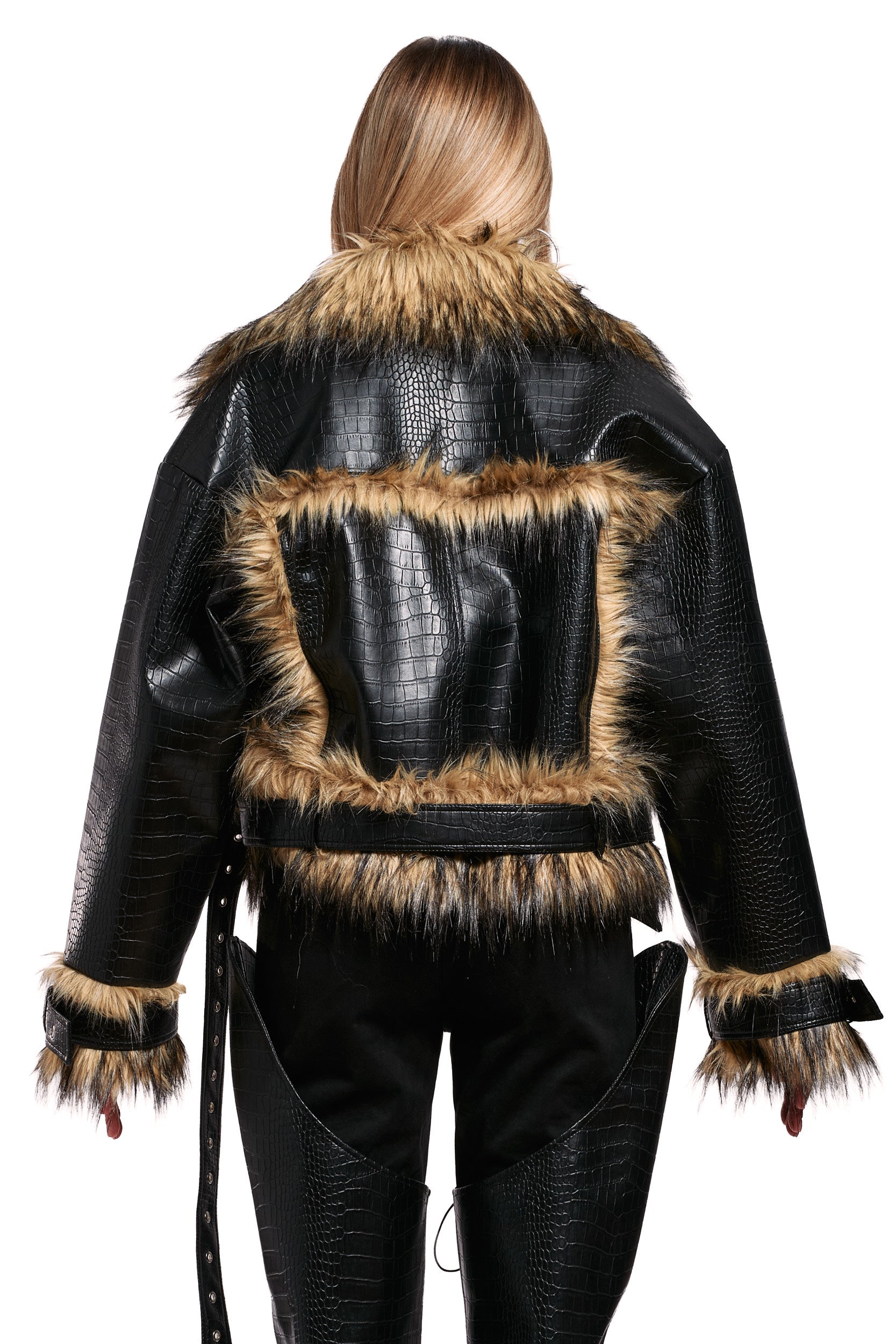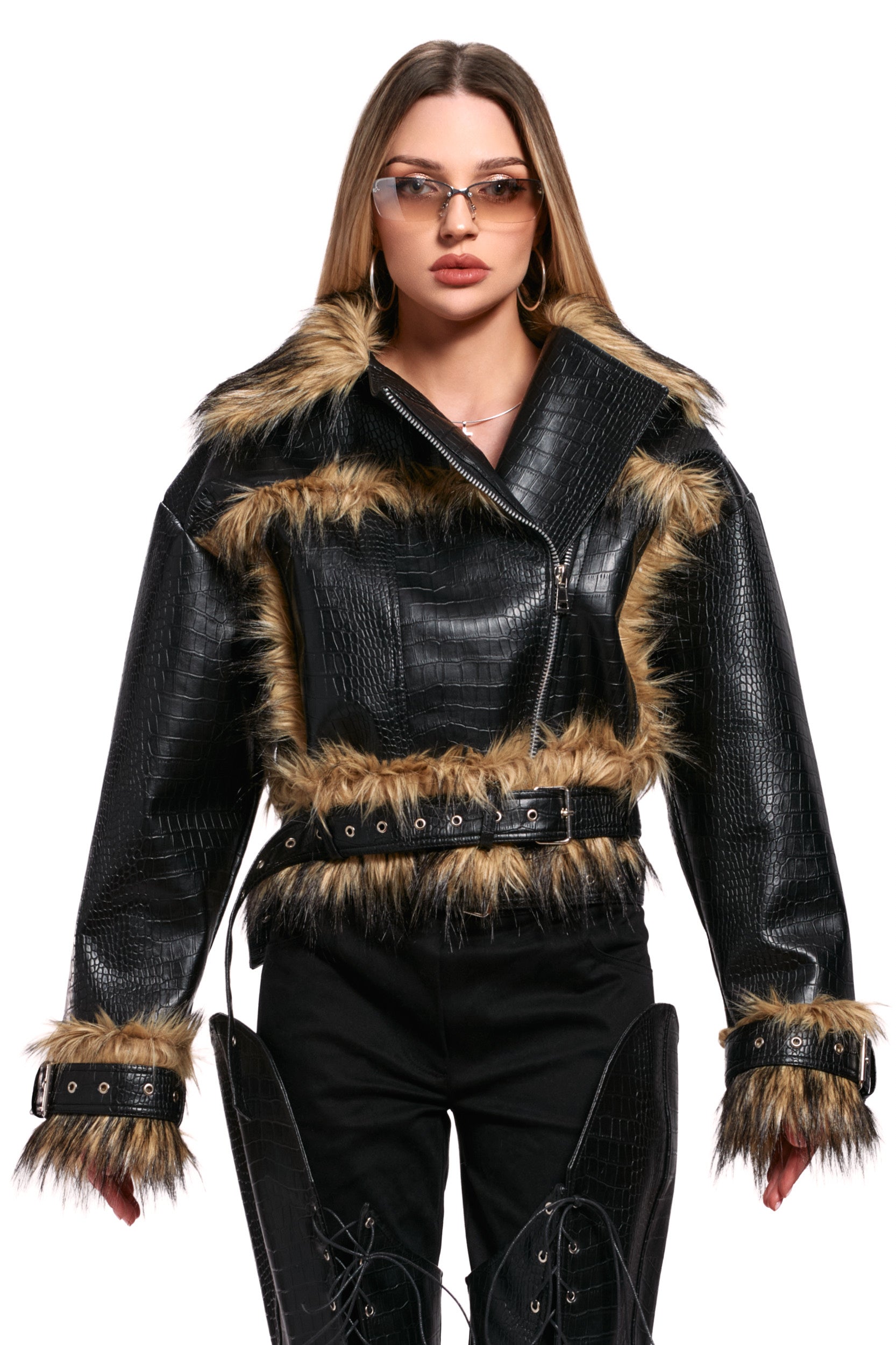 Geacă din piele ecologică si căptuşeală matlasată, accesorizată cu ocheți, curele și inserții de blană artificială.