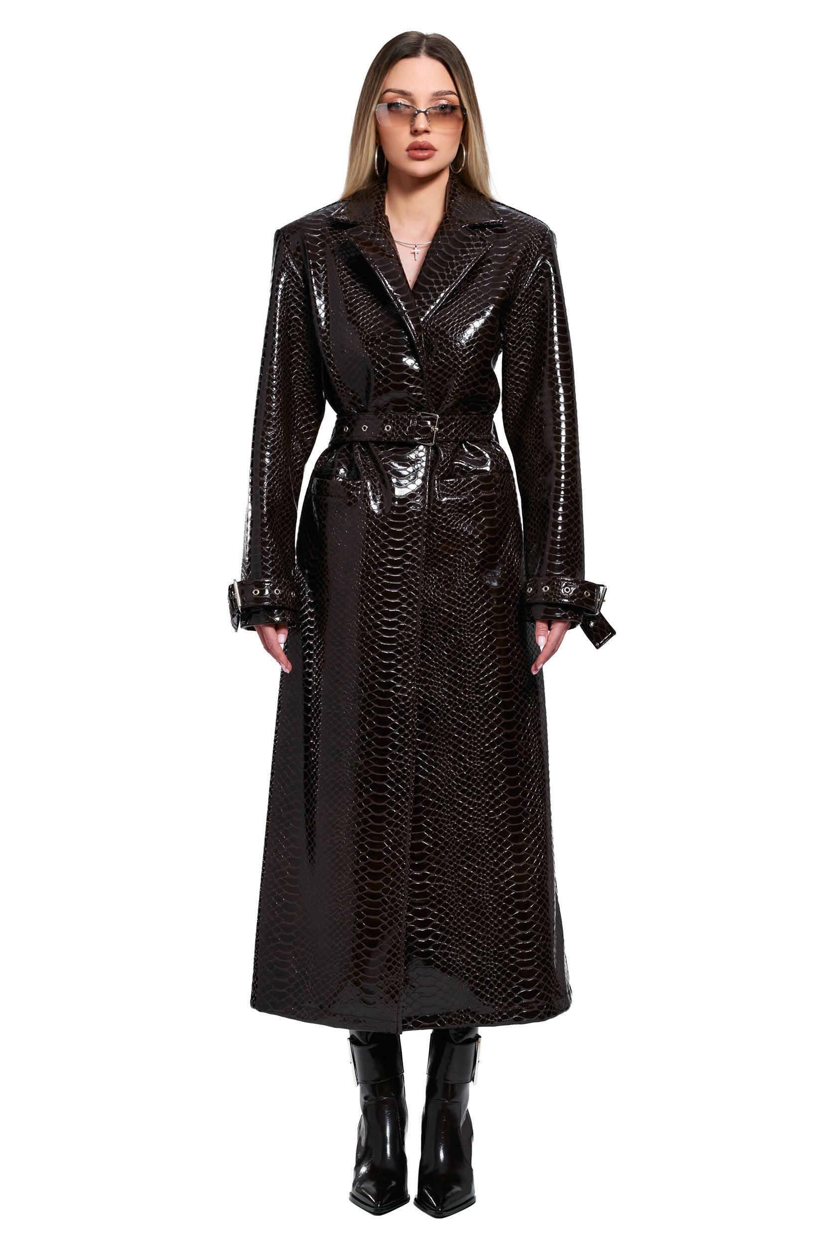 Palton lung din piele ecologică maro închis, prevăzut cu o curea și cataramă metalică.